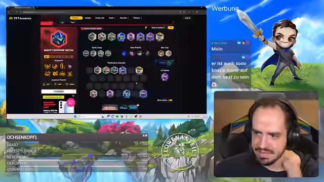01:43:31Streamer analysiert die aktuelle Meta des neuen Patches, insbesondere die Beliebtheit von 3-Kost-Rerolls und spezifischen Items wie Krakenslayer. Die Spielstile der deutschsprachigen Teilnehmer wie Coinit, Solo-Gesang und Pader-Bolle werden vorgestellt und ihre Eröffnungen und Item-Choices (z.B. Pocket Rechner, Starguardian) besprochen. Der Fokus liegt auf der Organisation und den Entscheidungen in den ersten Runden der Lobby.