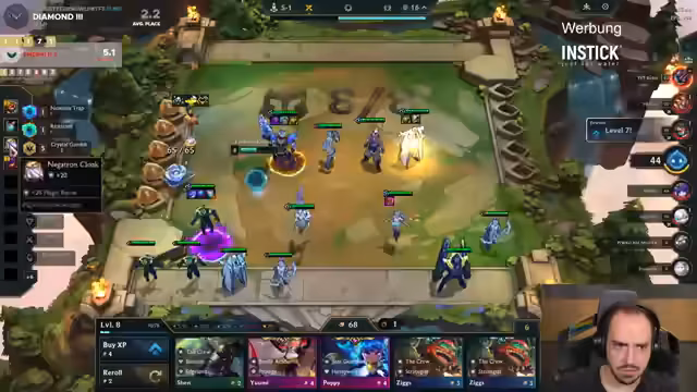 00:16:32In einem konkreten Spiel entscheidet sich der Streamer gegen die Sniper-Kombo und spielt stattdessen eine Sechs-Protector-Komposition mit Strategist. Er kritisiert, dass er manchmal zu sehr auf vorgefertigte, von Pros empfohlene Set-ups fixiert ist, anstatt sie auf seine eigene Spielsituation anzupassen. Nach einem Sieg durch ein sehr starkes Board räumt er ein, dass er manchmal nicht optimal positioniert, aber dennoch aufgrund der Itemstärke gewonnen hat.