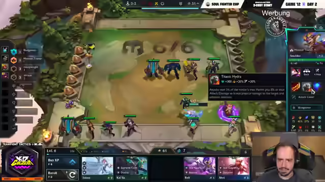 03:56:56Die Spieler Bobstar und Volta kämpfen um wichtige Platzierungen, wobei Volta zwingend einen ersten Platz benötigt. Bobstar rollt aggressiv, während Coinet wegen seines Boards besorgt ist. Es wird die Bedeutung von Star Guardians und Jinx hervorgehoben, wobei Pepper Force als optimales Item für Jinx gilt. KCW spielt Malsa und verteilt die Items spannend. Pepper Force scheint sich als bestes Jinx-Item herauskristallisiert zu haben, sobald man irgendwas Richtung Mana hat. Es wird die Frage aufgeworfen, ob die Top-Spieler deutlich besser sind als der Rest, was zu einem Gefühl des "Lost-Seins" führt. Ein Spieler hat einen Wissensvorsprung und setzt unbemerkte Tricks ein. KCW hat eine unfaire Wing Condition mit Twister Tate und spielt um den Sieg mit Jinx 1 und Poppy 2. Marcel hat ein starkes Board, aber es läuft nicht lucky für ihn. Arca hat eine Katastrophe mit Smolder 3 und Level 14. Cutter 3 hat viele Losts in Folge, aber viel Geld. Wolter gewinnt gegen Coinit, während Cutter kocht. Volta versucht einen Rolldown, aber es läuft nicht gut. Er fittet die Jenna und will Varus nicht einpacken, um die Jinx zu hitten. Robustoy hittet Lux 3 Star, was ein Giga-Int ist. Coinet gewinnt seinen Fight und Wolter scheidet aus. Marcel und Arkhoff sind die Verfolger von Coinit. Coinet steht perfekt und hat einen Raum mit auf dem Board. Arctio ist sehr stark, verliert aber vielleicht gegen Paderboy.