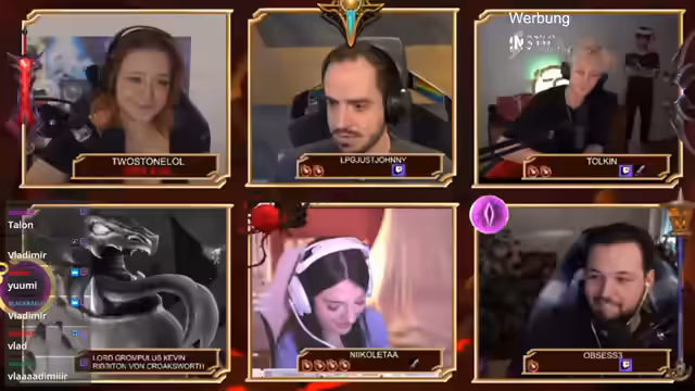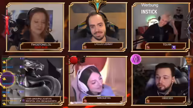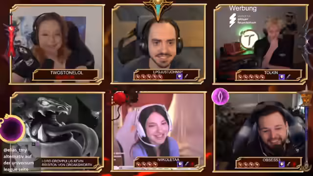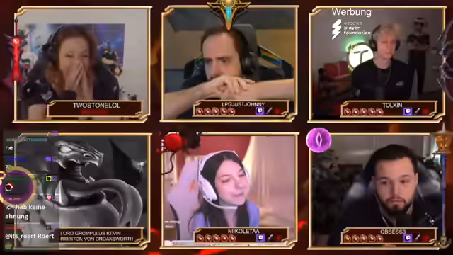 00:11:30Der Stream wechselt zu persönlichen Fragen über die Teilnehmer selbst. Beispielsweise wird gefragt, mit welchen mystischen Wesen Opsi im Chat verglichen wird (Golem, Oga, Dino), für welchen Champion Johnny bekannt war (Morgana, Nivir) oder welches Tier Toykin in Chats darstellt (Affe). Es kommt zu Joker-Einsätzen: Blutmagie verbindet Johnny und Toykin für gemeinsame Antworten, und Verrat wird verwendet, um Antworten zu verdoppeln. Die Fragen werden humorvoll kommentiert, und es entstehen Diskussionen über die Korrektheit von Antworten. Ein Teilnehmer (Nicoletta) verliert durch falsche Antworten Leben.