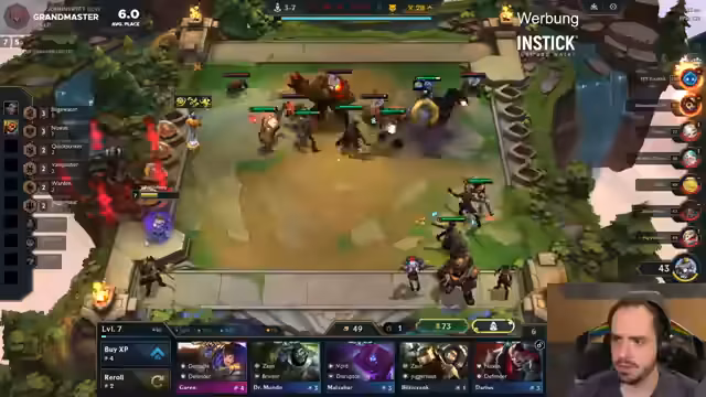 01:15:45Der Streamer startet ein neues TFT-Spiel mit einer Yordle-basierten Strategie. Er erklärt detailliert die Yordle-Synergie, die es ermöglicht, durch automatische Rerolls jede Runde Einheiten auf Drei Sterne zu verbessern. Dabei diskutiert er die risikoreiche Natur dieser Taktik, die Item-Verteilung auf Tristana und Shen, sowie die Herausforderungen, frühzeitige Entscheidungen über Übergänge zu anderen Champions wie Freljord oder Noxus zu treffen.