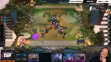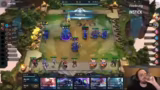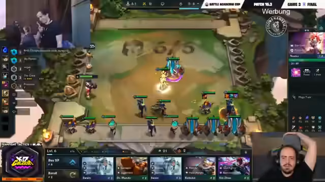 01:00:27Die Spieler machen Fortschritte im Spiel, wobei Double eine Gwen auf seinem Board platziert und 8-12 Fighter aufbaut. Salvi gewinnt einige Fights, verliert aber auch wichtige Duellen. Coinit erreicht Top 2, während Bensek und Salvi leichte Rücken erleiden. Die Platzierungen werden regelmäßig aktualisiert und die Chancen auf einen Sieg im Checkmate-Format werden diskutiert.