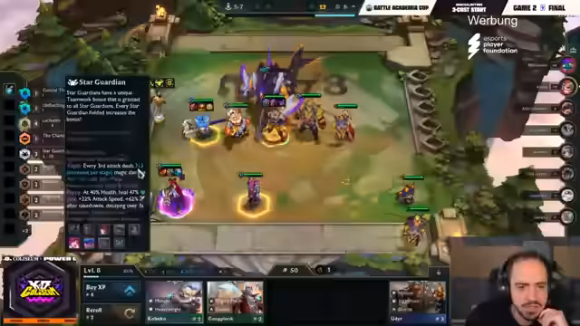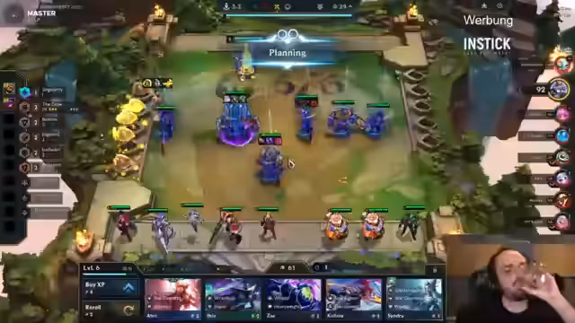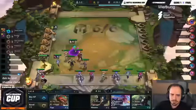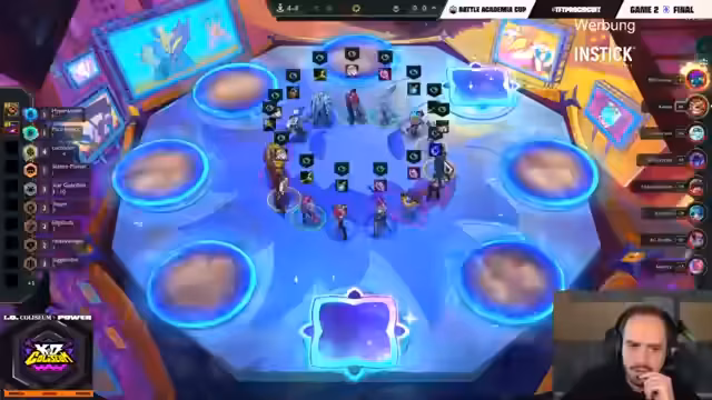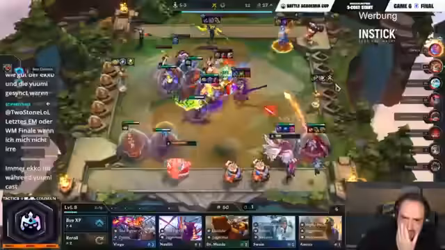 00:05:12Während des Turniers werden die einzelnen Matches live analysiert. Der Streamer bewertet die Item-Builds und Positionierungen der Spieler, wie etwa Coinits Entscheidung für eine Yuumi-basierte Komposition und Sylvies Versuch, über Scoreboard Scrapper ins Late Game zu kommen. Er kommentiert die strategischen Entscheidungen der Spieler, wie Risikominimierung, Gold-Management und die Timing von Power-Spikes.