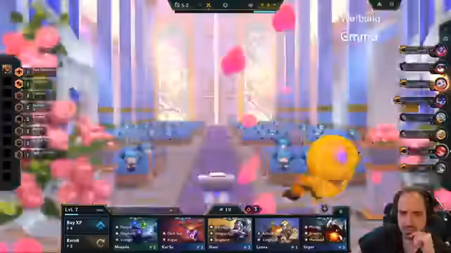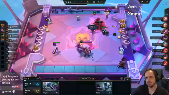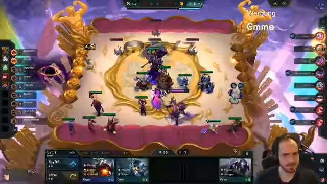 03:19:06Im Fokus des Streams steht der Spieler Coinit, der mit der Evelyn-Region spielt, was als sehr spannend und selten eingestuft wird. Seine Eröffnung wird analysiert, die aus der Poppy 2, Timebreaker und Savings Accounts besteht. Ein überraschender Fehler ist, dass Coinit die Poppy nicht rollt, was den Gameplan in Frage stellt. Stattdessen wird vermutet, dass er auf Upgraded Units zielt, um später ins Rollen für One-Cost Units zu gehen. Ezreal wird als Upgrade für die Bank identifiziert.