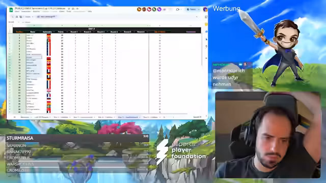 00:00:04Tag 2 der TFDM-Qualifikation hat begonnen. Der Streamer begrüßt das Publikum und stellt fest, dass unter den 64 Besten 8 bis 9 deutsche Spieler sind. In der aktuellen Lobby sind vier deutsche Vertreter anwesend: Vega, Asu, WhyUMadPro und Yamato. Trainer-Golem wird als weitere Figur erwähnt. WhyUMadPro spielt eine Christa-Gambit-Konfiguration, die mit dem High-Ido-Emblem als „CG-Lotterie“ bezeichnet wird und zu einer Top-Zwei-Runde führen kann.