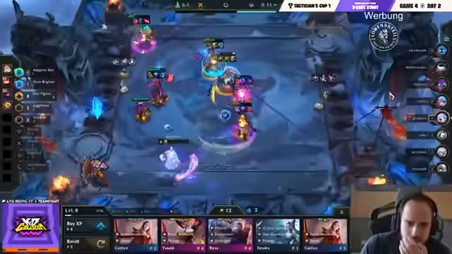 04:12:06Der Fokus verlagert sich komplett auf einen anderen Spieler: Kaiser. Mit nur einem Duplicator startet er eine fantastische Invested-Reroll-Komposition auf Level 10. Er erreicht Twisted Fate 3 und Zyra 3 und besitzt eine starke 115 AD Kaiser. Nach einem schwierigen Kampf gegen Broken mit einem Bug, der die Positionierung verzerrt, entscheidet er sich für den TF 3-Reroll. Seine Zyra 3 gewinnt daraufhin extrem dominant gegen einen gegnerischen TF 3 mit 7000 AP und sichert sich den Sieg, was als kranker Abschluss des Tages gefeiert wird.