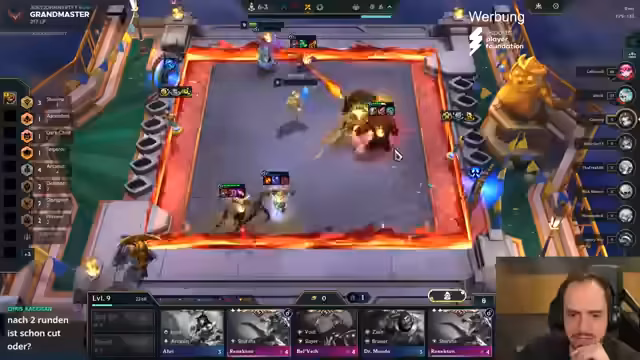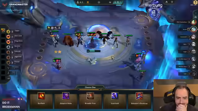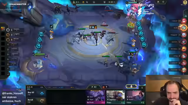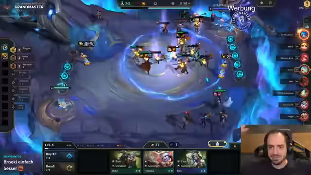 02:02:41Der Start der neuen Runde ist geprägt von verschiedenen 3-Cost-Einheiten und unterschiedlichen Augment-Wahlen wie Gold Destiny oder Pyromaniac. Ein Spieler entscheidet sich für einen aggressiven Kraken-Red-Buff-Start, hat jedoch Schwierigkeiten, eine stabile Frontline zu finden. Die Vorbereitung wird gelobt, da bereits in den Creep-Runden gezielt Items verteilt wurden. Andere Teilnehmer nutzen Augments wie Cluttered Mind für zusätzliche Erfahrungspunkte, während die Herausforderungen beim Spectating im Streamer-Modus kurz thematisiert werden.
