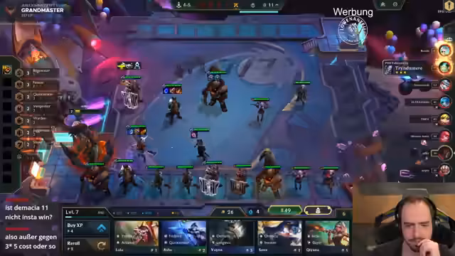 01:00:27Ein Spieler bereitet sich intensiv auf Quest-Belohnungen vor, indem er Gold für XP oder Rerolls spart, trifft jedoch auf eine ungünstige Questauswahl. Die Entscheidung gegen riskante Quest-Ziele wie drei Niederlagen in Folge wird analysiert, da dies den Board-Aufbau bis Runde 4-3 verzögert hätte. Stattdessen wird ein flexibles Board angestrebt, was hohe Anforderungen an das Spielverständnis stellt. Trotz eines Lowrolls bei den Champions wird ein Plan mit Timo-Items verfolgt, während das Erreichen von Level 8 aufgrund mangelnder Ressourcen schwierig bleibt.