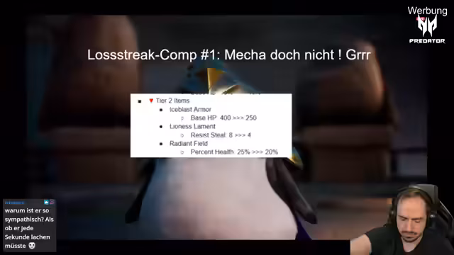 01:16:59Der Streamer erörtert verschiedene Item-Builds für Champions wie Aesol und Aesol, betont die Bedeutung von Stoneplate und Dirac als Pflicht-Items für bestimmte Setups. Er analysiert auch den Short-Bow mit Anti-Heal-Effekt und diskutiert die Skalierung von Items mit bestimmten Units. Die große Herausforderung sei es, ein ausbalanciertes Board ohne signifikante Nachteile zu erstellen, wobei bestimmte Items wie das laienes Lament abhängig von der Rüstung des Gegners wirken.