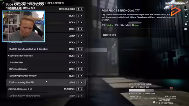 00:26:32Ein Teil des Streams widmet sich der technischen Optimierung für das beste Spielerlebnis. Der Streamer zeigt Empfehlungen für die Grafikeinstellungen, die er in einem Reel von Niko gefunden hat, um die maximalen FPS herauszuholen. Dazu gehören Anpassungen des Sichtfelds auf 110, der Helligkeit und Bildschärfe auf 50 sowie die Deaktivierung der Vertical Sync. Auch für Kopfhörer gibt er Empfehlungen, von den teuren Hörlux-Modellen bis zu preisgünstigeren Alternativen wie den Hörlux Easy Ups oder den Biodynamic MMX200.