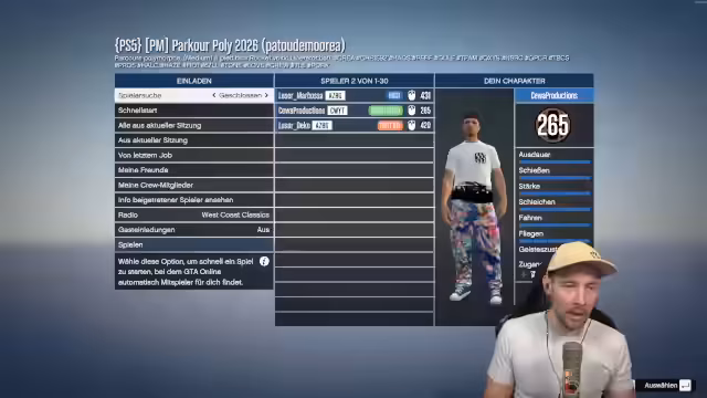 01:35:39Der Stream nimmt eine abschweifende, humoristische Wendung. Der Streamer und seine Mitstreiter, Cedric und Deko, tragen künstlerische Brillen und betonen den angeblich künstlerischen Charakter ihrer Aktionen. Ein zentraler Punkt ist ein Wettrennen zu Fuß, bei dem Cedric auffällig schneller ist. Dies führt zu Spekulationen über mögliche Cheats oder einen 'Unlock All Account', was zu hitzigen Diskussionen und zusätzlichen Wettspielen führt.