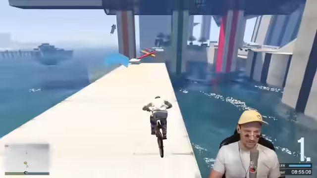 01:48:31Nach dem zu Fuß-Parcourse wechseln die Streamer auf andere Fahrzeuge, um denselben Streckenabschnitt zurückzulegen. Es kommt zu erneuten technischen Schwierigkeiten, insbesondere bei der Steuerung eines BMX-Rads. Der Streamer beschreibt, wie er es nicht schafft, auf einer Rampe das richtige Tempo zu halten oder einen Wheelie zu halten, was zu ständigen Stürzen und einem langen Warten auf die anderen führt, was seinen Frust steigert.