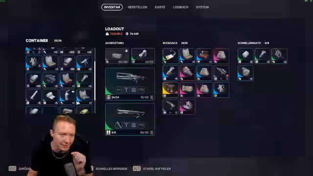 02:36:42Der Streamer diskutiert über sein volles Inventar und den Umgang mit Beutemarken, die ihm helfen, im Kriechen zu bleiben. Er erklärt die defensive Beutemark, die ihm ermöglicht, sich wieder auf 75 % Lebenspunkte zu regenerieren, wenn er sich nicht bewegt. Er führt durch sein Inventar, verkauft unnötige Munition und versucht, Platz zu schaffen. Er spricht über seine Aufträge und erwähnt das Projekt Expedition, das einen Charakter-Reset ermöglicht und extra Skillpunkte sowie Skins für fortgeschrittene Spieler bietet.