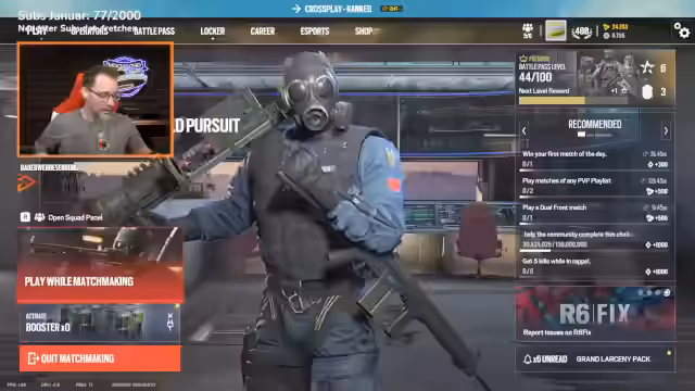 02:07:02Die Session endet mit dem Start eines Rainbow Six Siege-Quadra-Squad-Gameplays. Der Streamer begrüßt seine Mitspieler Petcat, Mabossa und Nuggie und erwähnt, dass es das Ranked-Spiel der aktuellen Season ist. Das Gegnerteam besteht aus Diamant-Spielern, was die Herausforderung für das unterlegene Team erhöht.