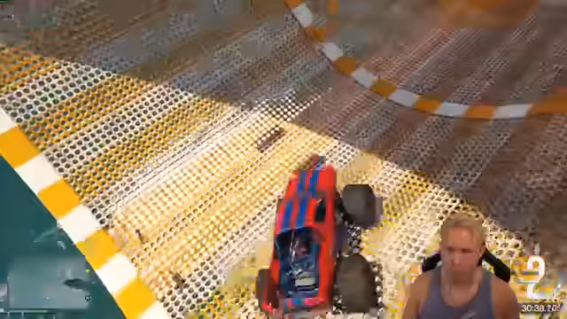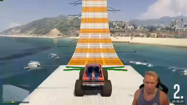 00:34:00Die Hauptaktivität des Streams ist eine Challenge-Map in GTA, bei der der Streamer und sein Mitspieler versuchen, mit einem Geländewagen eine extrem steile Rutsche hinaufzufahren. Nach zahlreichen gescheiterten Versuchen und anhaltendem Frust über die Steuerung mit dem Controller, gelingt es dem Streamer letztendlich, die Herausforderung zu meistern. Dabei kommen immer wieder Diskussionen über die Steuerung, die Spieldynamik und die Länge der benötigten Verschiebung auf.