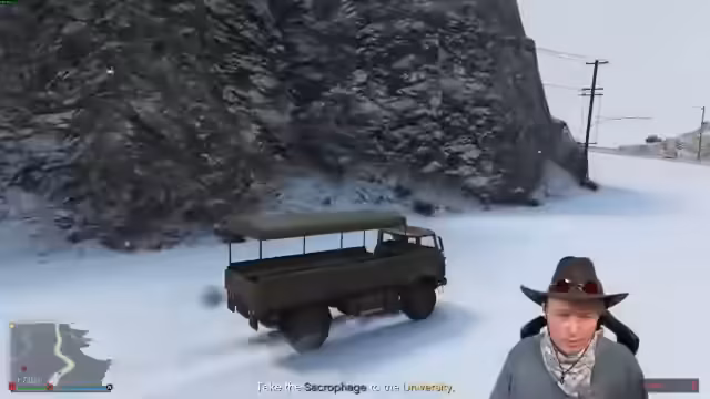 01:25:31Nach dem Diebstahl des Sarkophags führt ein Parkfehler des Streamers zu einer kritischen Situation. Der Anhänger, auf dem der Sarkophag liegt, ist blockiert, und niemand kann mehr auf das Fahrzeug zugreifen, um die Ladung zu sichern. Die Mission droht zu scheitern, da das Fahrzeug unbrauchbar wurde und der Sarkophag nicht transportiert werden kann. Das Team muss einen Plan B entwickeln.