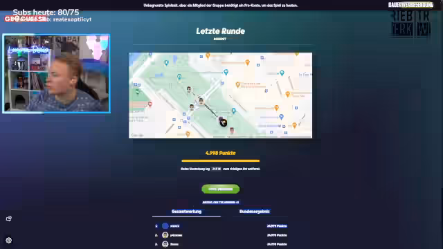 04:41:51Der Streamer wechselt das Thema und spielt GeoGuessr, ein Geographie-Spiel. Er versucht, verschiedene Orte auf der Weltkarte zu identifizieren, basierend auf Bildern und Hinweisen. Es kommt zu einem intensiven Wettkampf zwischen dem Streamer und seinen Zuschauern, bei dem um die beste Platzierung gerungen wird. Der Streamer zeigt sowohl Wissen als auch Humor bei seinen Vermutungen.