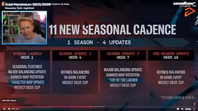 05:10:50Nach dem intensiven Gaming-Teil wechselt der Stream das Format und präsentiert eine Reaktion auf ein Video des YouTubers Corny. Dieses Video analysiert die offizielle Roadmap von Ubisoft für Rainbow Six Siege im Jahr 2026. Die wichtigsten Themen sind eine erhöhte Update-Frequenz, eine Rotation der Ranked-Maps, gezielte Map-Anpassungen innerhalb einer Season sowie die Einführung einer neuen Champions-Playlist zur aktiven Bekämpfung von Cheatern.
