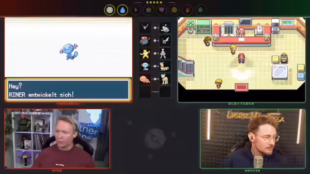 01:32:24Der Streamer ist mit seinem Pokemon-Team unterwegs und diskutiert über Entwicklungen. Pupita könnte sich entwickeln, Rhino muss auf Level 20 hochgelevelt werden, um sich zu entwickeln. Es gibt eine Debatte, ob Stolunior, Stolrak und Stolos die richtigen Entwicklungen sind. Der Streamer überlegt, ob er das Helix Fossil nehmen soll und fragt den Chat nach Empfehlungen. Rhino lernt Lehnschuss und der Streamer muss zurückgehen, um den Stein zu anklicken.