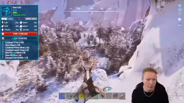 04:56:02Die Suche im Winterbiom und später im Schneebiom nach einem hochwertigen T-Rex verläuft frustrierend. Trotz langer Flügen und des Tötens mehrerer Dinos werden nur Exemplare mit schlechten Werten gefunden. Die Situation eskaliert tödlich, als ein Puluvia den Managama tötet, was zu einem Totalverlust führt. Dieser Teil des Streams ist geprägt von Rückschlägen und der Enttäuschung, keine derartigen Dinos zu finden, und der Streamer gibt die Suche vorerst auf, um das Projekt fortzuführen.
