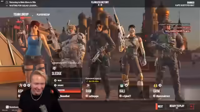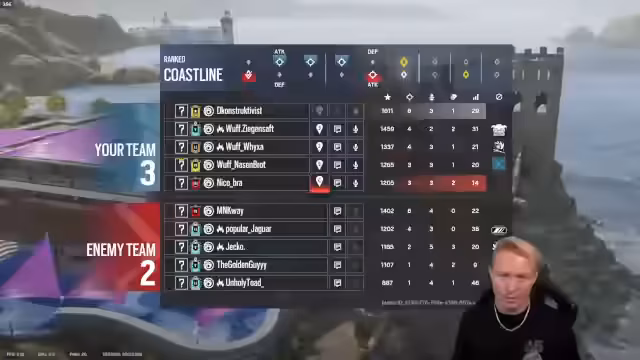 02:12:34Die Spieler starten eine Session in 'Rainbow Six Siege' im Ranked-Modus auf der Karte 'Coastline'. Der Streamer kündigt an, 'mindestens eine Stunde, R6' zu spielen. Es wird über die Wahl der Operatoren diskutiert, wobei der Streamer sich für IQ entscheidet, inspiriert von professionellen Spielern. Die Teamzusammenstellung und die Strategie für die Runde werden besprochen, einschließlich der Bann-Phase, in der Operatoren wie Fenrir und Asami genannt werden. Während des Spiels kommt es zu einer kritischen Situation, in der der Streamer mit IQ versucht, Gadgets zu zerstören, aber letztendlich scheitert und eliminiert wird. Die Niederlage wird als 'unlucky' bewertet, und die Spieler reflektieren über die Effektivität von IQ in höheren Elos und die Notwendigkeit, die Drohnen besser zu nutzen. Die nächste Strategie beinhaltet die Wahl von Ram und Fuse, um die Gegner von unten anzugreifen.