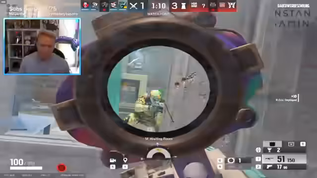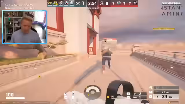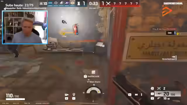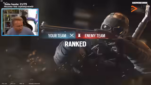 01:03:18Das Rainbow Six-Spiel geht weiter, der Streamer wechselt regelmäßig die Mitspieler aus. Währenddessen tauchen erneut technische Probleme auf, die sich in kurzzeitigen Rucklern im Stream äußern. Trotzdem ist das Gameplay im Game stabil. Es werden verschiedene Operativen wie Sledge, Breach und Ace eingesetzt, um die Gegner auszuschalten. Der Streamer spielt aggressiv und kommentiert seine Spielzüge und die Taktiken seiner Gegner. Er wünscht sich, dass Marvin anwesend wäre, um mitzuspielen. Das Gameplay ist geprägt von Siegen und Niederlagen, was für den Rang Bronze 4 typisch ist.