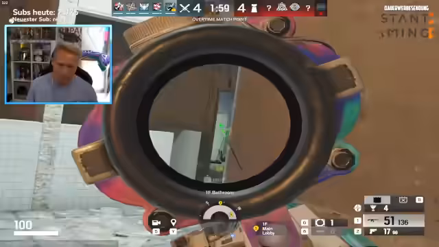 01:17:13Der Stream startet mit technischen Einstellungen und Spielbeginn. Es wird eine Auflösung von 1080p bei 60 FPS eingestellt. Im ersten Spiel auf dem Map 'Clubhouse' wird ein Blitz-Schild im Closer-Spot gesichtet und Zero im selben Bereich lokalisiert. In den ersten Runden des Spiels gibt es taktische Verschiebungen und Unsicherheiten, wie das Verpassen eines Gegners im Closet, was Frustration beim Spieler hervorruft. Parallel dazu werden technische Aspekte wie Prime-Abonnements erklärt und die Performance der Ausrüstung diskutiert, wobei kurzzeitig Verbindungsprobleme auftreten und Drops auftreten.