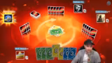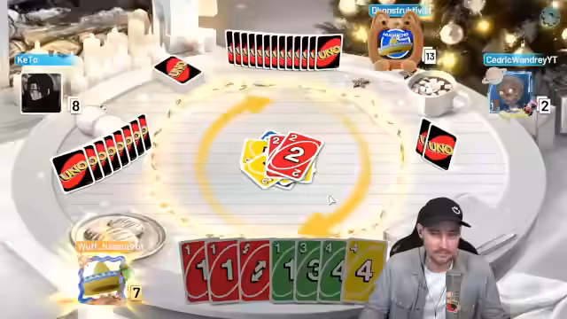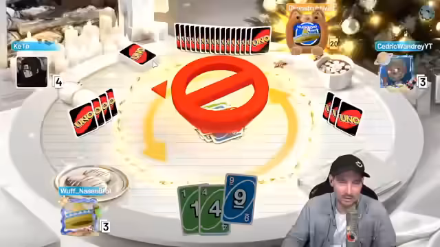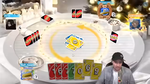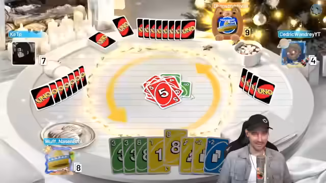 01:10:02Nachdem die technischen Hürden überwunden sind, widmet sich der Streamer den Regeln von UNO, insbesondere der ungewöhnlichen Option, eine identische Karte zwischenzulegen. Es werden die spezifischen Effekte der Zahlenkarten wie 7 (Kartentausch mit einem Spieler) und 0 (Kartenweitergabe an alle) erläutert. Die ersten Spielrunden verlaufen chaotisch und von viel Rage und humorvollen Beschimpfungen unter den Spielern geprägt, was den Unterhaltungswert erhöht. Ein Highlight ist ein missglückter Zug, bei dem ein Spieler eine Plus-4-Karte gegen sich selbst ausspielt.