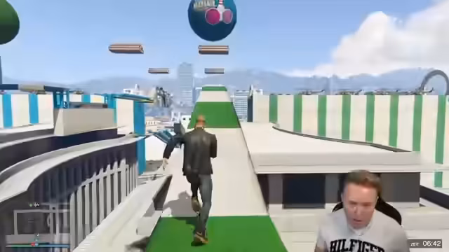00:42:01Es wird überlegt, nach GTA einen Deathrun zu spielen. Jeremy und Nuki sind von der Idee weniger begeistert. Es wird Runners vs Runners gespielt, wobei nicht aufeinander geschossen wird, sondern auf Gegenstände, die heruntergeschossen werden können. Ziel ist es, als Erster ins Ziel zu kommen. Die Teams bestehen aus Deko und Marvin gegen Jeremy und Nugi. Es wird über die Steuerung des Flugzeugs mit den Num-Tasten diskutiert, die sich als unpraktisch erweist. Es wird erklärt, dass die blauen Spieler auf der anderen Seite Fallen aktivieren können, indem sie auf Gegenstände schießen. Es wird vereinbart, nicht aufeinander zu schießen, sondern nur auf die Gegenstände. Es wird über die Steuerung beim Zielen diskutiert. Nugi wird von einer Bowlingkugel erwischt und brennt. Es wird festgestellt, dass die LKWs für oben sind. Jeremy wird abgeschossen. In der nächsten Runde wird sofort losgerannt und nach oben geschossen.