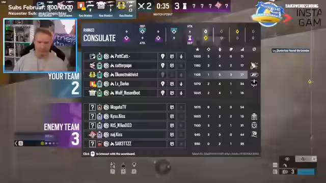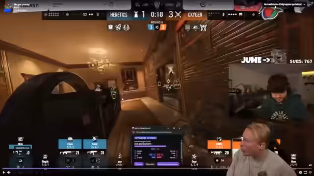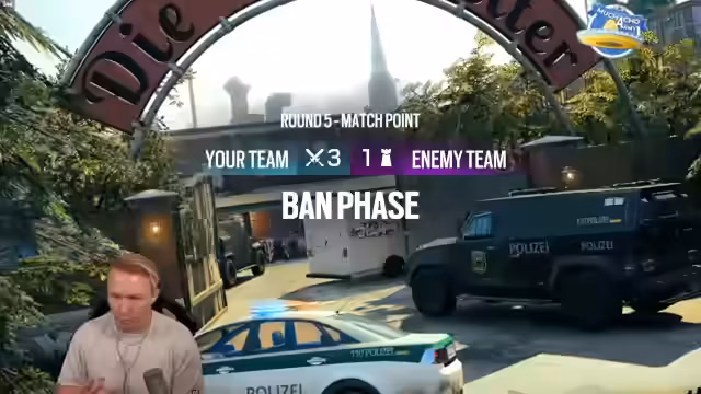 04:06:04Der Stream beginnt ein neues Ranked-Spiel im Modus Clubhouse zusammen mit seinen Teamkollegen Marbossa, Petcat und Jeremy. Er erwähnt, dass Petcat ihn als Asami ge-pickt hat, obwohl der Fokus auf Cash liegt, was zu Verwirrung führte. Die Aufstellung des Teams wurde kritisch gesehen, da es keinen Bandit oder klassischen Foot-Hold-Operator gab. Das Gameplay ist geprägt von Kommunikation und strategischen Entscheidungen, aber auch von Problemen wie der fehlenden Hilfe bei einem Gegner und einem unglücklich verlorenen Teamkampf in der Garage.