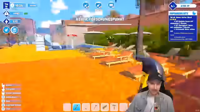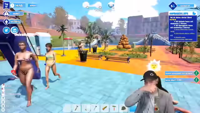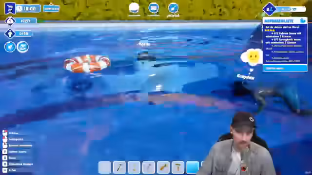 00:43:49Der Streamer arbeitet weiter daran, seinen Park im Waterpark-Simulator zu optimieren. Er hat das Ziel, zwei Rutschen und drei Sprungbretter mit mindestens drei Sternen zu bauen, stellt jedoch fest, dass er dafür erst noch die nötigen Forschungspunkte sammeln muss. Er kümmert sich um die Sauberkeit des Parks, leert Mülleimer und schubst stinkende Gäste weg. Dabei ärgert er sich über die geringe Kapazität seiner Taschen und plant, in größere zu investieren. Er entdeckt, dass er den Eingangsbereich streichen kann, was er sofort umsetzt, um das Aussehen des Parks zu verbessern. Die neuen Mülleimer werden gut angenommen, aber der Kampf gegen den Müll und die stinkenden Gäste bleibt eine Herausforderung. Der Streamer überlegt, ob mehr Duschen oder bessere Mitarbeiter helfen könnten. Er sammelt Forschungspunkte, um neue Attraktionen und Verbesserungen freizuschalten, darunter Dekorationen wie ein Totem und größere Müllbehälter. Er plant, einen Erlebnispark mit Schwimmbad zu bauen und beginnt bereits mit der Gestaltung des Bodens.