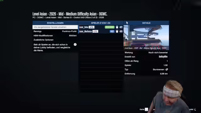 01:15:05Der Stream beginnt mit der Erwähnung eines erfolgreigen GTA Online Parcours, der zweimal gemeistert werden konnte. Nach einem kurzen Ausflug zur Getränkepause wird eine neue Map mit dem Namen 'Level Asian 2026' gestartet. Diese Map wird als Herausforderung mit mittlerer Schwierigkeit beschrieben, deren Dauer auf etwa 20 bis 30 Minuten geschätzt wird. Der Streamer und ein Jeremy probieren sich an den ersten Passagen, wobei der Streamer einen humorvollen Vergleich mit einem japanischen Fischer anstellt, da er ein Stirnband trägt.