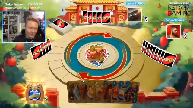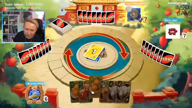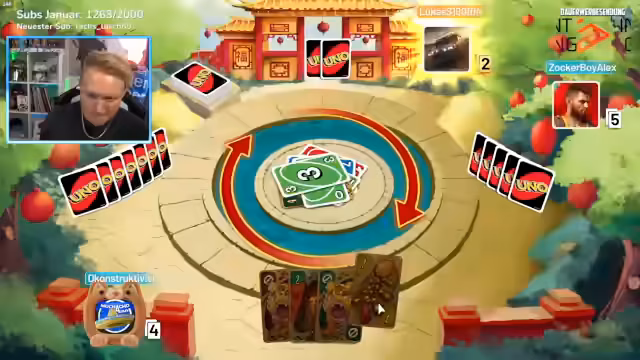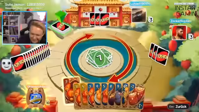 03:53:15Die neue UNO-Runde beginnt, und die Karten werden verteilt. Nico hat zwei gelbe 3, was für ihn vorteilhaft ist, da es ihm ermöglicht, den nächsten Spieler aufzuhalten. Der Streamer bemerkt, dass Lukas nicht mehr in der Lobby ist und fragt nach ihm. Cedric hat auch nur noch eine Karte. Der Streamer warnt die anderen Spieler, dass Cedric bald gewinnen könnte, und sie müssen ihn aufhalten.