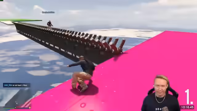 00:53:10Das Stream-Team spielt gemeinsam die GTA-Karte 'Panto-Parcours' und versucht, verschiedene Hindernisse zu überwinden. Dabei kommt es zu technischen Problemen mit Reifen, die zerschossen werden, und 'Black Screens', die die Orientierung erschweren. Der Streamer gibt Tipps zur Vorgehensweise und kommentiert die Versuche seiner Mitspieler Jeremy und Deko live im Chat. Das Ziel ist es, die Map erfolgreich abzuschließen.
