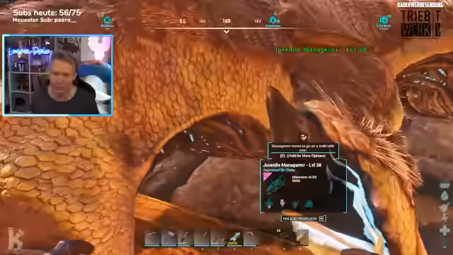 00:26:05Es wird mit ARK Extinction begonnen und auf eine produktive Runde gehofft. Es wird überlegt, einen Ziegenmann-Tempel oder Dreadmare-Schrein zu errichten. Vor der Aufnahme ging ein Drop runter, weswegen sich auf die Suche nach einem blauen Drop begeben wird. Die XP-Rate wurde auf 3,5 erhöht. Es wird ein roter Lootjob gefunden, der aber nicht das gewünschte Ergebnis bringt. Es wird erwähnt, dass ein grüner oder blauer Job machbar wäre. Es wird beschlossen, mit dem Petri loszufliegen, um nach einem geilen Alosaurus oder Velo zu suchen. Es wird überlegt, den Kano zu testen, der aber erst einen Sattel benötigt. Es wird ein Level 120 Edmontonia entdeckt, bei dem aber noch unklar ist, wie man ihn zähmt, da die Leute gesagt haben, man müsse ihn mit Feuer zähmen. Ein Level 140 Velo wird ebenfalls entdeckt.