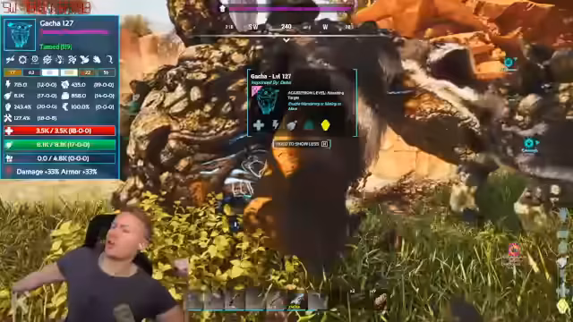 02:30:00Der Streamer führt einen Test mit dem blauen Kibble durch, das aus dem Inventar stammt, um zu prüfen, ob es fürs Tamen von Dinos wie dem Ankylo oder Duedicus geeignet ist. Obwohl der Test fehlschlägt, da der Duedicus nicht reagiert, wird das Tier trotzdem gezähmt. Der Duedicus erreicht ein sehr hohes Level von 145, was auf die Wirksamkeit des Kibble hindeutet, obwohl der Chat den Erfolg bezweifelt. Gleichzeitig wird ein neuer Gacha mit der Fähigkeit, Schwefel herzustellen, entdeckt, was für zukünftige Projekte wie Feuerfallen wichtig ist.
