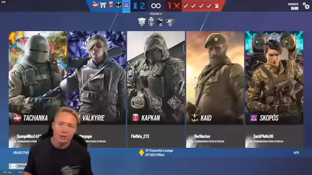03:39:23Die Streamer starten ein neues Rainbow Six-Spiel auf der Map Bank. Es geht um die Teamzusammenstellung mit Jeremy, Flowrider und Riecher. Die Gegner sind Axel Klatsch und Axel Klotz. Die Streamer diskutieren über die beste Wahl von Operatoren und Taktiken, um zu gewinnen. Es geht auch um das Punktesystem und den Rang, den die Spieler erreichen wollen.