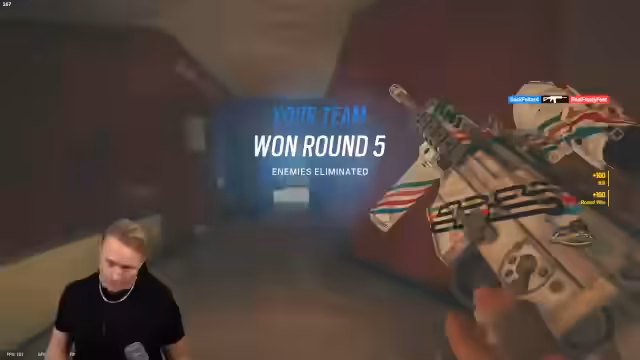 04:40:24Das Team des Streamers gerät in Verteidigungsnot, als ein Gegner in der Garage auftaucht und eine massive Bedrohung darstellt. Durch geschickten Einsatz von Calls und Claymores gelingt es dem Team jedoch, den Angreifer zu eliminieren. In der folgenden Runde übernimmt der Streamer eine defensivere Rolle und sichert wichtige Bereiche wie die Kitchen. Trotzdem schafft es das Gegnerteam, den Diffuser zu platzieren. In einem dramatischen Finale gelingt es dem Team, die Gegner knapp zu besiegen und sich so den Sieg in der Runde zu sichern.