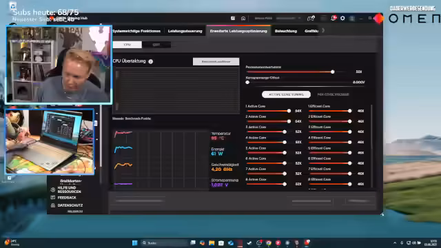 01:29:50Der Streamer stellt den Omen Max 16 Gaming Laptop vor und zeigt dessen Monitoring-Software. Diese ermöglicht die Überwachung von CPU-, GPU- und RAM-Auslastung sowie der Netzwerkleistung. Es wird erläutert, dass man verschiedene Leistungsstufen von 'Echo' bis 'Unleashed' einstellen und sogar die Lüfterdrehung sowie die CPU übertakten kann, um die Leistung zu optimieren.