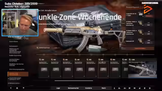 05:36:40In der Extraction-Shooter-Session (vermutlich Arena Breakout) plant das Team den nächsten Einsatz. Der Streamer diskutiert Taktiken für einen Raid, erwähnt einen ausstehenden Platz im Team und lädt Zuschauer ein, sich per Chat zu melden. Während des Spielens betrachtet er Marktpreise für Ausrüstung und Waffen wie die H416 oder AR-57, vergleicht Preise und entscheidet sich, eine Waffe zu kaufen. Das Team tauscht sich über den Loot aus und verhandelt über die Verteilung von Gegenständen wie Waffen, Schutzwesten und Munition.