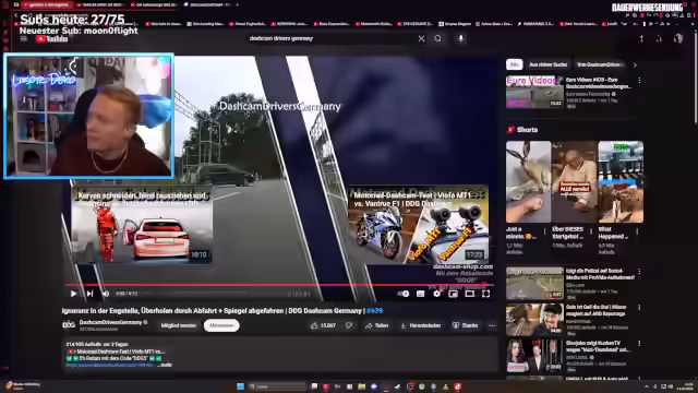 00:30:26Der Stream wechselt zu einer Reaction auf ein Dashcam-Video von Dashcam Drivers Germany, nachdem vorher ein video mit künstlicher Stimme als enttäuschend empfunden wurde. Es werden verschiedene Verkehrsszenien kommentiert, wobei sowohl unsicheres Fahrverhalten als auch spezielle Situationen wie Transporte mit offenen Kofferraumtütern kritisch beleuchtet werden. Ziel ist es mit den Zuschauern über sicheres Fahren zu diskutieren.