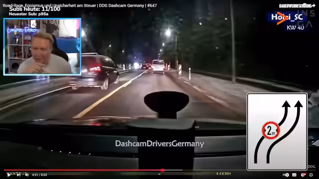 00:34:44Die Hauptreaktion des Streams gilt dem Video 'Dashcam Drivers Germany'. Der Streamer analysiert mehrere Verkehrsszenen und äußert Kritik an rücksichtslosem Verhalten wie unnötigem Rechtsüberholen in Kurven und aggressiven Fahrmanövern. Besonders ein älterer LKW-Fahrer wird kritisiert, der dauerhaft die Spur verfehlt und vermutlich keine adäquate Fitness mehr für den Straßenverkehr besitzt. Das Thema Baustellenmarkierungen und deren Missachtung wird ebenfalls angesprochen, ebenso wie die Legalität von Blitzer-Apps, die im Video gezeigt werden.