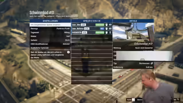 Es wurde ein GTA-Parkour-Duell zwischen zwei Teilnehmern veranstaltet. Während des Wettkampfs kam es zu schwerwiegenden Konflikten, da sich die Spieler im Wege standen. Der Map-Design wurde als extrem frustrierend und unfa设计的 kritisiert. Im Anschluss wurde die technische Umsetzung der Hindernisse analysiert und auf die fehlende Distanz zu diesen hingewiesen.