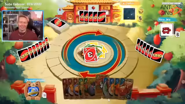 02:11:41Der Streamer spielt UNO und diskutiert intensiv über seine Karten und die Züge seiner Mitspieler Darko, Nico und Padcat. Er ist frustriert über seinen eigenen Spielstil und die glücklichen Züge der anderen. Es kommt zu einem heftigen verbalen Schlagabtausch, bei dem er sich von seinen Mitspielern geärgert und sabotiert fühlt. Trotzdem vergisst er nicht, seine Handkarten wie die beiden blauen Karten von Darko im Auge zu behalten, was auf eine fortgesetzte und taktisch geprägte Runde hindeutet.