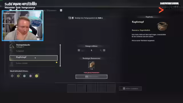 01:36:31Zu Beginn des Streamings konzentriert sich der Streamer auf die Sammlung von Ressourcen wie Kupfererz und Ton. Er baut einen Holzkohlemeiler und Schmelzofen, um Kupferbarren herzustellen. Der Erfolg beim Tonabbauen mit der Spitzhacke wird gefeiert, während er gleichzeitig die Erstellung verschiedener Werkzeuge und Gegenstände plant. Die Suche nach zusätzlichen Ressourcen führt ihn in eine Höhle, wo er erfolgreich Kupfererz findet und weiterverarbeitet.