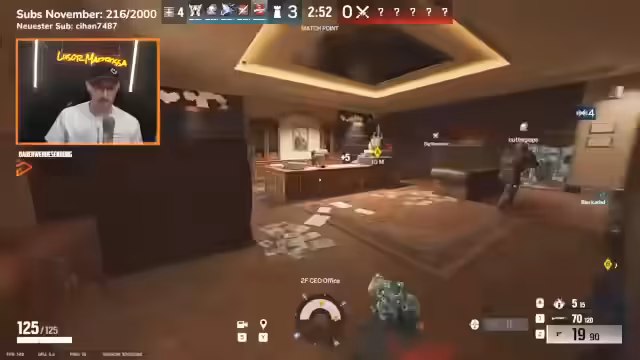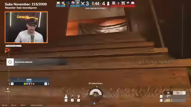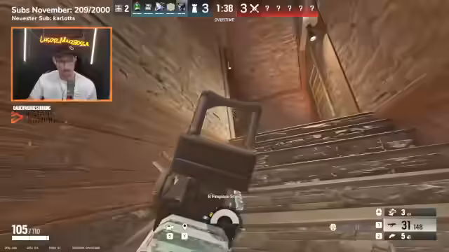02:49:20Die Spieler bereiten sich auf die nächste Runde vor, wobei ein Spieler überlegt, wieder Kapital oder Monty zu wählen, um Support zu leisten. Es wird erwähnt, dass das Fenrir-Gadget in der vorherigen Runde zerstört werden konnte, da die Gegner nicht alles verstärkt hatten. Die Gegner haben Vigil gewählt und befinden sich wahrscheinlich im Basement. Ein Spieler, Fabian, hat Echo. Es wird überlegt, ob die Gegner aus dem Basement herausbrechen könnten. Ein Spieler entscheidet sich, als Monty vorzugehen, um die Situation zu klären. Es wird festgestellt, dass Central Stairs und Kitchen 'clear' sind, und der Plan ist, Kitchen zu öffnen. Die Suche nach Fenrir gestaltet sich schwierig, und ein Spieler wird durch C4 eliminiert, während ein anderer den Kopfschuss verfehlt.