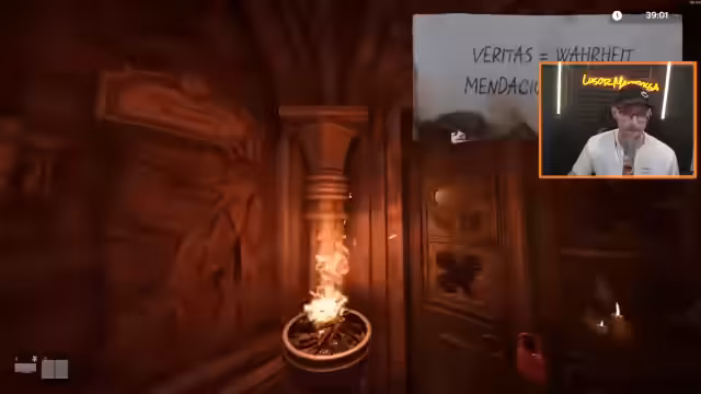 04:14:13Die Streamer versuchen, einen Mechanismus mit mehreren Hebeln zu bedienen, die wie Monde aussehen. Es stellt sich heraus, dass die Hebel in einer bestimmten Reihenfolge gedrückt werden müssen, um sie zu arretieren. Nach einigen Versuchen gelingt es, die Hebel korrekt zu positionieren. Ein weiteres Rätsel, das sich auf „Veritas ist Wahrheit“ und „Mendazium ist Lügen“ bezieht, wird gelöst, indem die Aussagen der Charaktere richtig zugeordnet werden. Dies führt zur Öffnung der Haupttür. Anschließend muss ein Rätsel gelöst werden, das die „Tore der Hölle“ und die „Tore des Himmels“ betrifft, wobei die Blickrichtung einer „Schwester“ und ihres „dunklen Bruders“ korrekt eingestellt werden muss. Dies führt zur Entdeckung eines weiteren Schlüssels, was den Fortschritt im Escape Room sichert.
