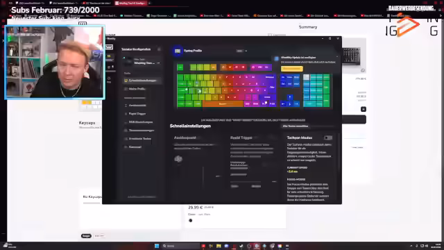 00:25:43Immer wieder unterbrochen vom Gameplay, führt der Streamer ein Gespräch über neue Hardware-Anschaffungen. Er zeigt die neu gekaufte Ducky One X Mini Tastatur und äußert seine Bedenken bezüglich des fehlenden Ziffernblocks und der Pfeiltasten, die in bestimmten Situationen wie dem BIOS essential sind. Parallel dazu plant der Erwerb neuer Keycaps für sein Keyboard, wobei er sich unsicher ist zwischen einer komplett durchscheinenden Variante und einer Kombination aus opaken und transparenten Tasten. Die Entscheidung wird von der Community um Rat gebeten.