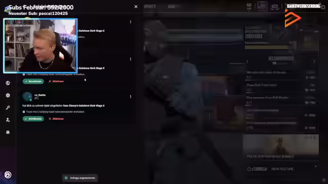 00:20:35Die Show wechselt nun vollständig zu 'Rainbow Six: Siege'. Der Streamer checkt die neuesten Twitch-Drops für das Spiel und ist erleichtert, dass sie erhalten sind. Im Chat werden technische Probleme bezüglich des Voice-Chats angesprochen, woraufhin der Streamer die Zuschauer anleitet, bestimmte Schritte zu unternehmen, um dies zu beheben. Er startet nun ein Ranked-Spiel in der Champion-Promo für seinen Mitspieler 'Ghost Rider'.