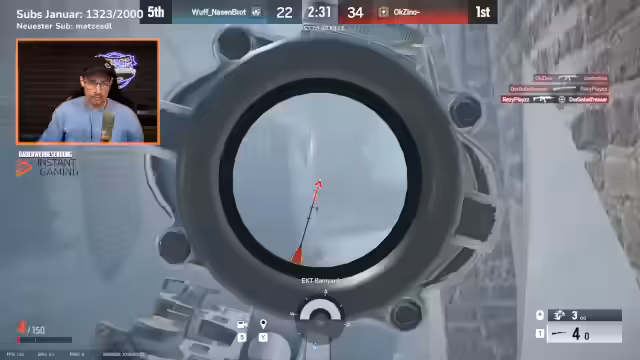 01:07:25Gegen Ende des Streams wechselt der Streamer zu Rainbow Six: Siege, um das zeitlich begrenzte 'Spermafrost'-Event zu spielen. Sein Ziel ist es, in drei Matches die Top 3 zu erreichen, um zusätzliche In-Game-Packs zu erhalten. Er spielt mit mehreren aus dem Chat mitgenommenen Spielern, hat jedoch Schwierigkeiten, in den kleinen Runden Kills zu landen und landet mehrmals auf den hintersten Plätzen. Trotzdem gelingt es ihm mehrmals, unter die Top 3 zu kommen, auch wenn die Belohnung manchmal verzögert erscheint.